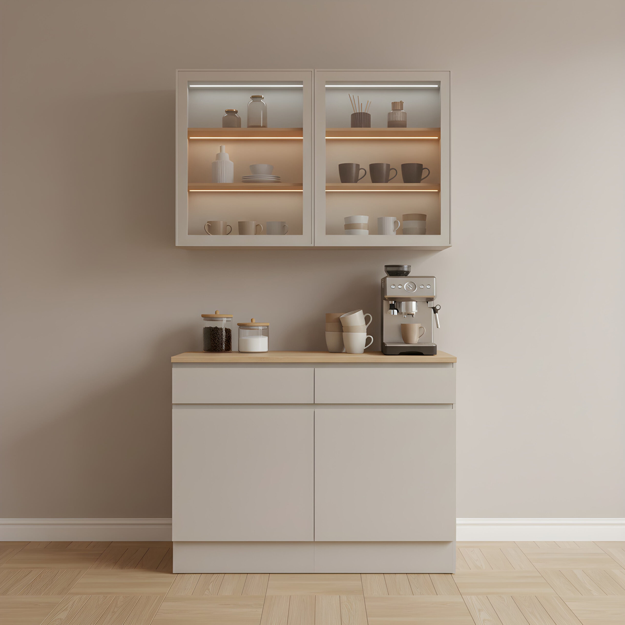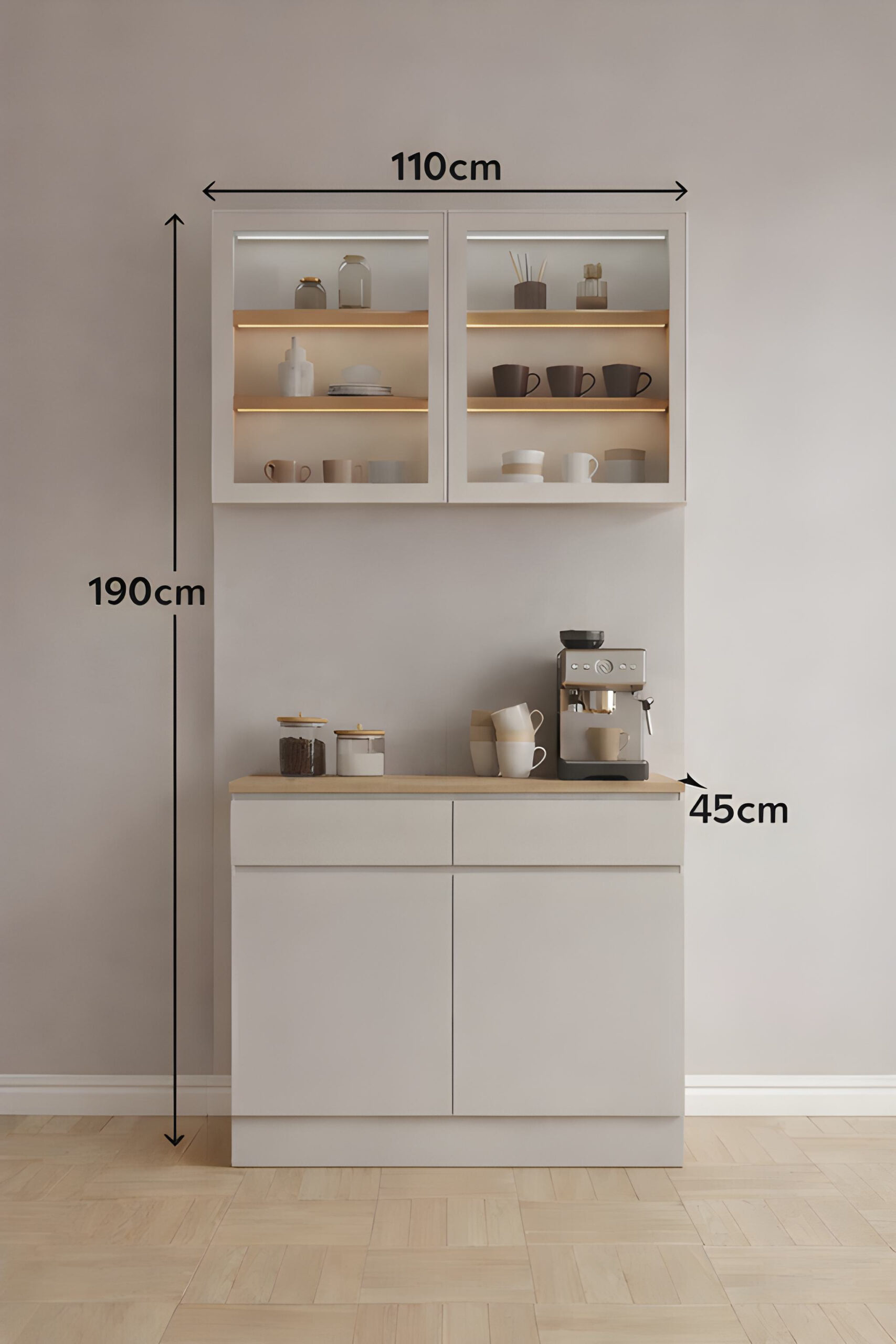 Üst bölümde yer alan cam kapaklı dolaplar, fincan, kupa ve kahve aksesuarlarını düzenli ve şık şekilde sergileme imkânı sunar. Vitrin içi LED aydınlatma, kahve köşesini hem dekoratif hem de fonksiyonel hale getirir. Orta bölümde bulunan geniş tezgâh alanı, espresso makinesi, filtre kahve makinesi ve diğer kahve ekipmanlarının rahatça kullanılmasına olanak tanır.
