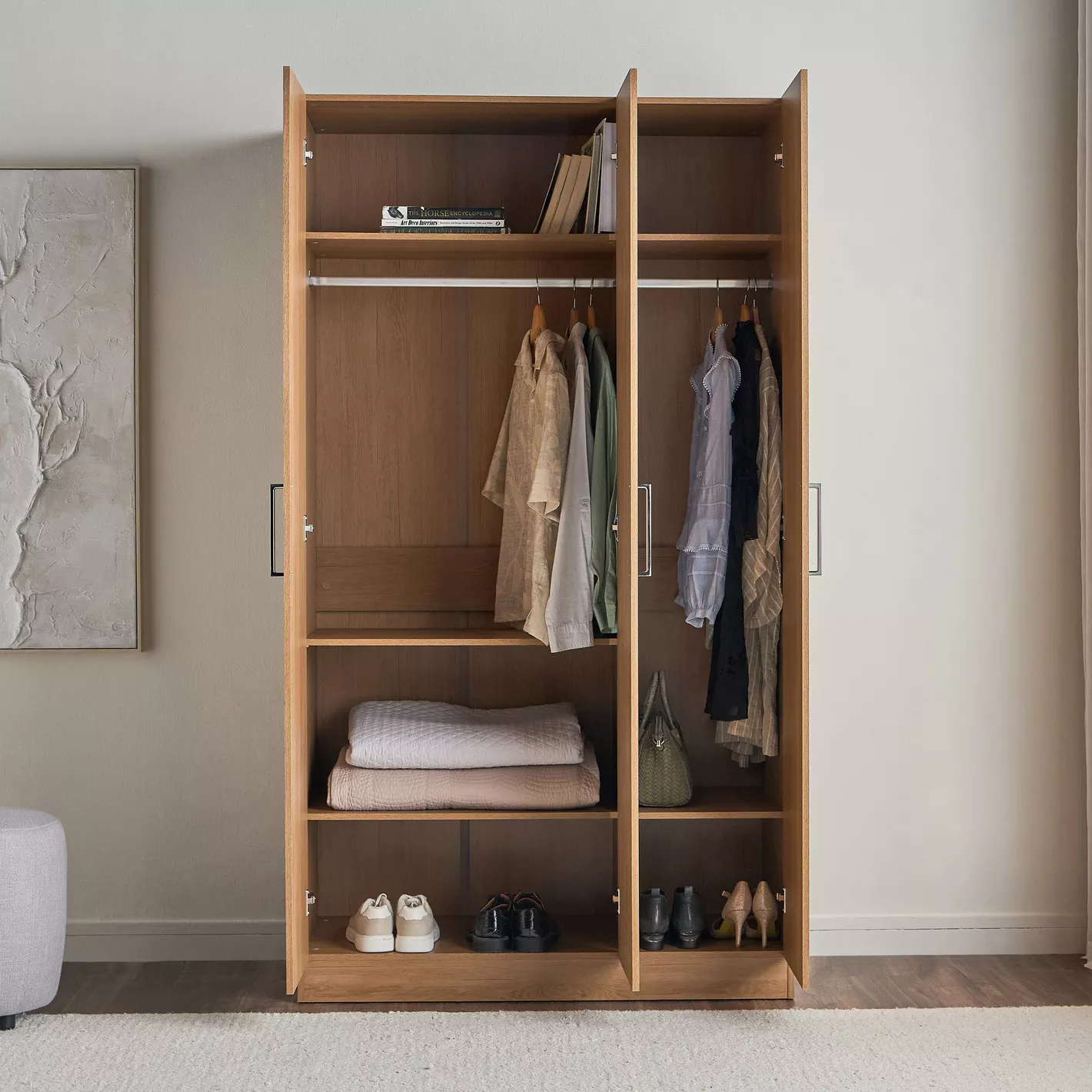 Dayanıklı suntalam malzemeden üretilen 3 kapaklı dolap, uzun ömürlü kullanım sunar. Askılık ve raf sisteminden oluşan iç donanımı sayesinde gömlek, mont, elbise ve katlanabilir kıyafetler için pratik bir kullanım sağlar. Geniş hacimli gardırop arayan kullanıcılar için hem düzenli hem de erişimi kolay bir yapı sunar.