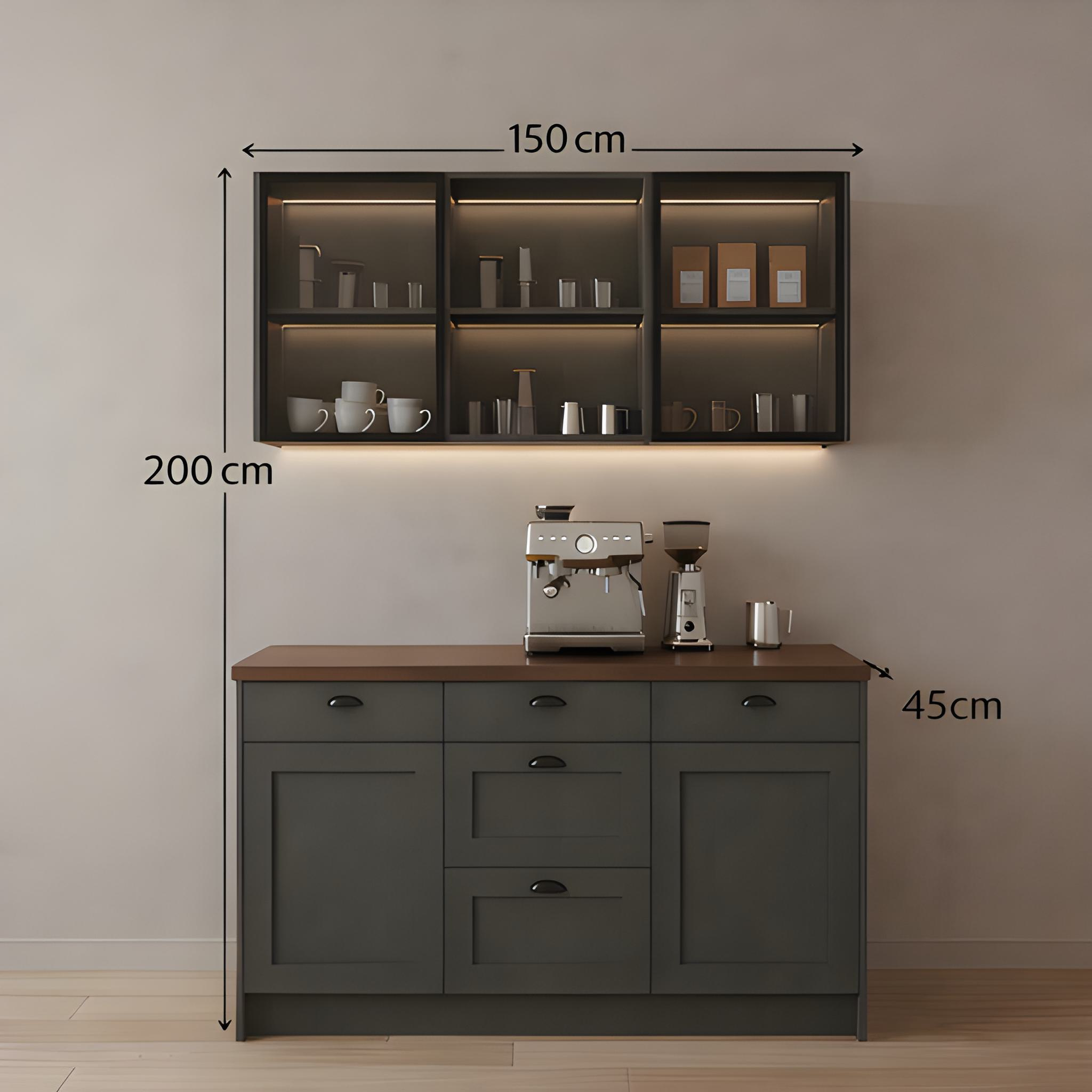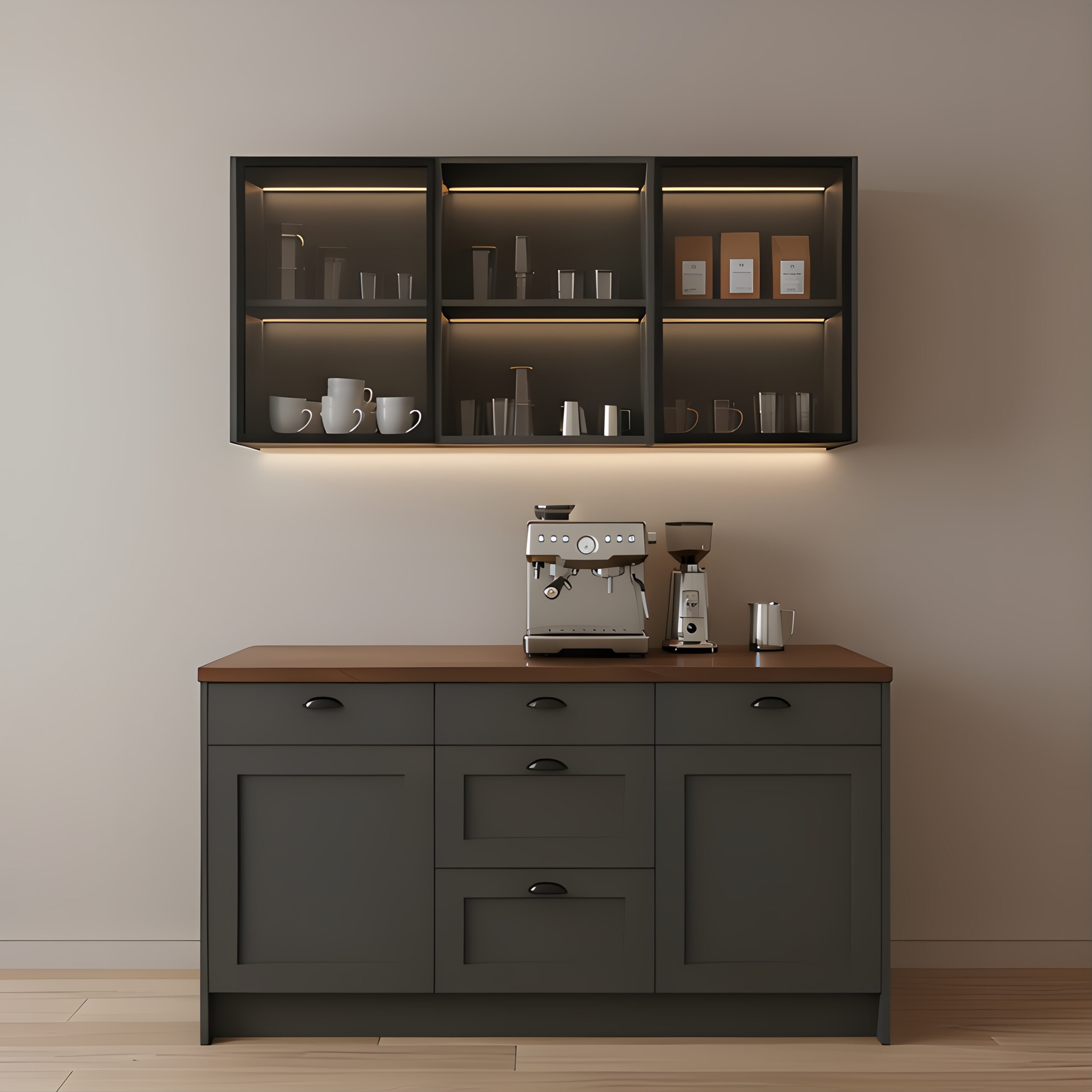 Cam raflı vitrin bölümü, fincan, kupa ve dekoratif aksesuarlarınızı sergilemenize olanak tanırken; entegre LED aydınlatma, kahve köşenizde sıcak ve davetkâr bir atmosfer oluşturur. Geniş tezgâh alanı, espresso makinesi, filtre kahve makinesi ve kahve ekipmanlarının rahatça kullanılmasını sağlar.