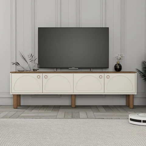 Minimalist dekorasyon ve bohem ev stili ile mükemmel uyum sağlayan bu TV ünitesi; salon, oturma odası ve yaşam alanlarında düzenli ve ferah bir görünüm oluşturur. Geniş yüzeyi sayesinde televizyonunuzu estetik bir şekilde konumlandırırken, kapaklı bölmeleriyle düzenli bir kullanım alanı sunar.