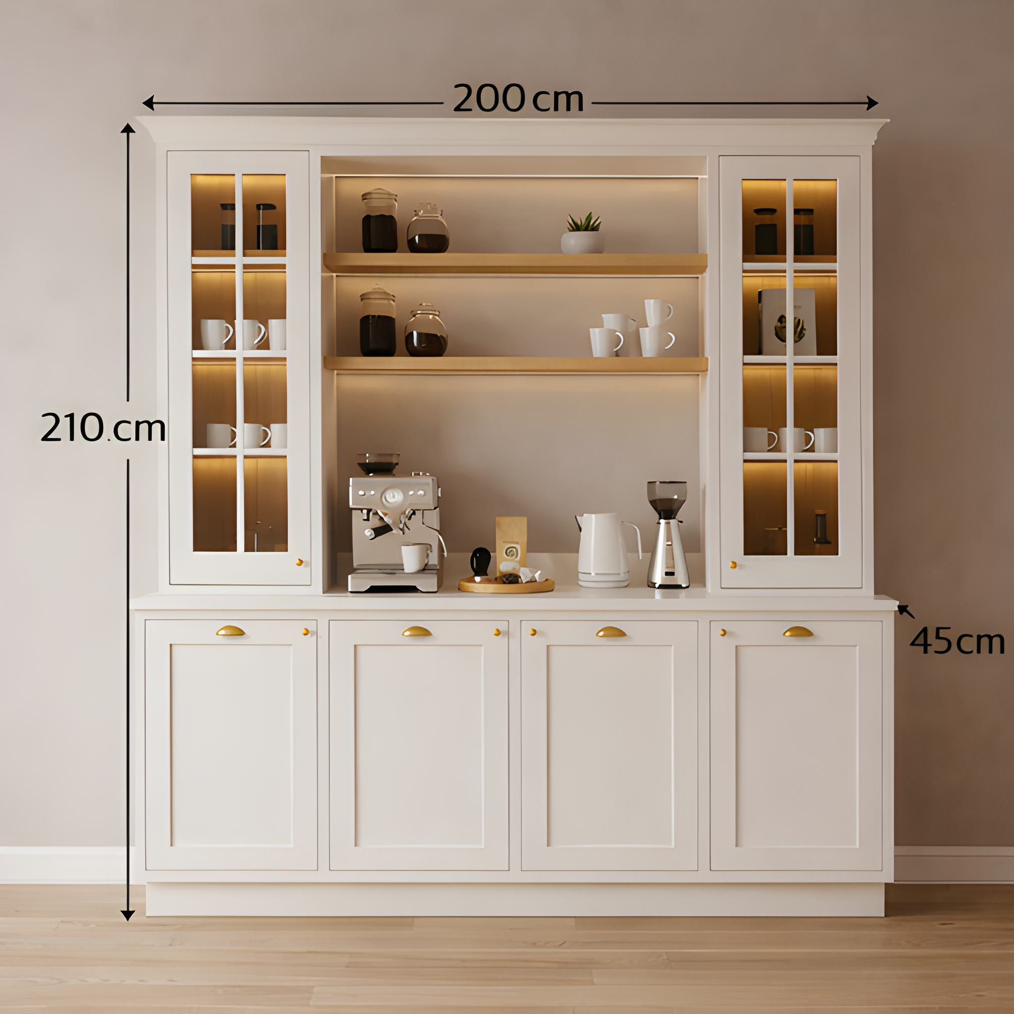 Vanilla Glow Kahve Köşesi, zamansız tasarımı ve sıcak LED aydınlatmalı vitrin yapısı ile evinizde şık ve düzenli bir kahve alanı oluşturur. Cam kapaklı üst vitrin bölümü fincan, bardak ve aksesuarlarınızı estetik şekilde sergilemenizi sağlarken; geniş tezgâh alanı kahve makinesi, kettle ve günlük kullanım için maksimum konfor sunar.
